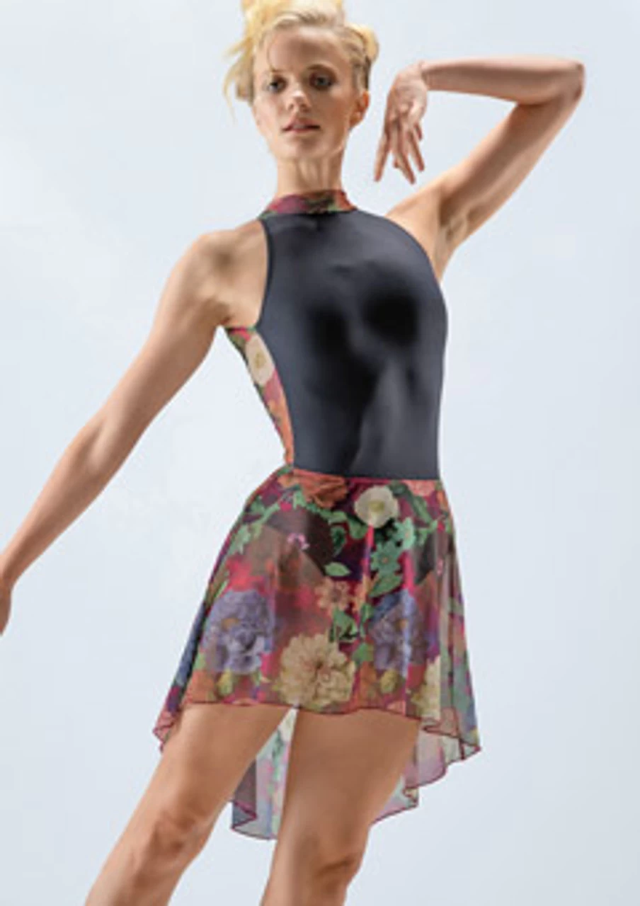 A stunning lightweight mesh skirt from Ballet Rosa. The printed stretch mesh features a beautiful floral design that can be worn all year round. The high-low look allows the skirt to flow with you as you move. The skirt is easy to pull on and off making fast outfit changes possible. We would style this with the Ballet Rosa Gabriella Mesh Yoke Scoop Back Tank Leotard for a complete look.