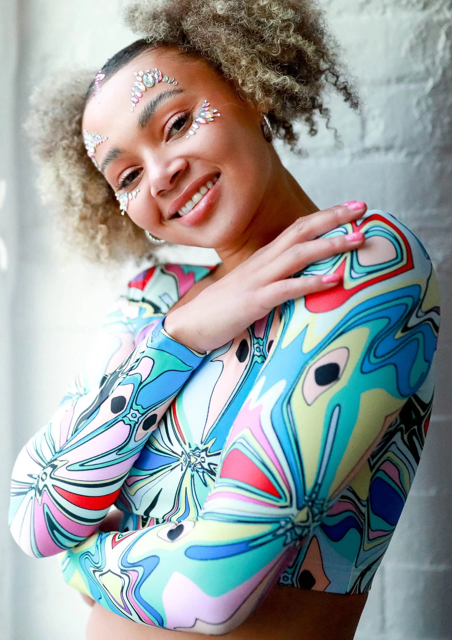 Four way stretch fabric makes this abstract print crop top a perfect fit whilst the ultra matt polyester gives high coverage and holds its shape well. The multi-colour bright print makes a statement and is complimented by the modern square neckline. Vivid print flows down the long sleeves and onto a full covered back. This comfortable crop looks amazing as a co-ord when styled with the Move Dance Nebula High Waisted Cycling Shorts. Alternatively it makes the perfect jeans and nice top combo!