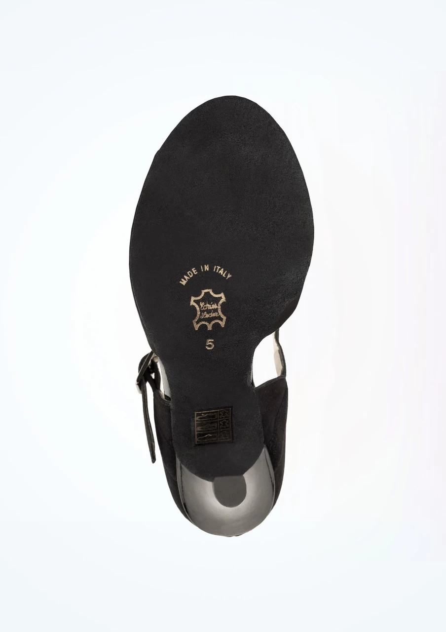 A stunning ballroom, latin and salsa shoe from the Nueva Epoca collection by Werner Kern. The open toe vamp features a full panel of suede supper and the high rise back and wide ankle strap help give this shoe more impact than usual dancesport shoes. The high patent heel is suitable for a more experienced dancer.