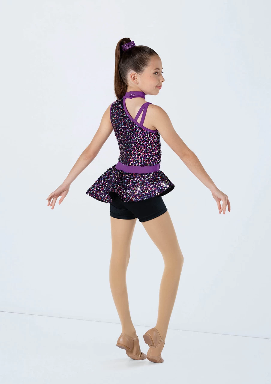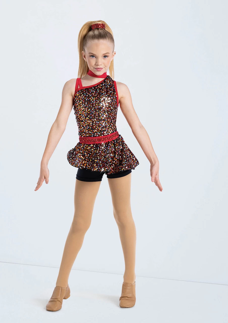 -Asymmetric peplum biketard features Razzle Dazzle sequin spandex
