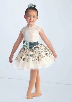 Sequin floral leaf mesh top skirt over sequin trim tricot