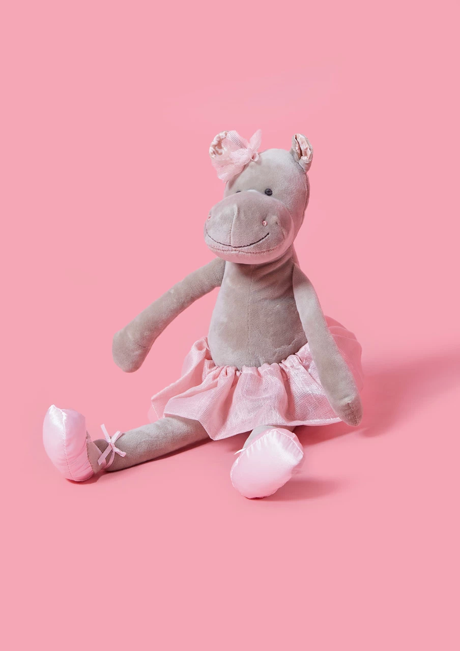 Pretty in pink! Lou Hippo is an adorable soft toy for little dancers. She wears a dainty bow with a matching pink tutu and ballet shoes.